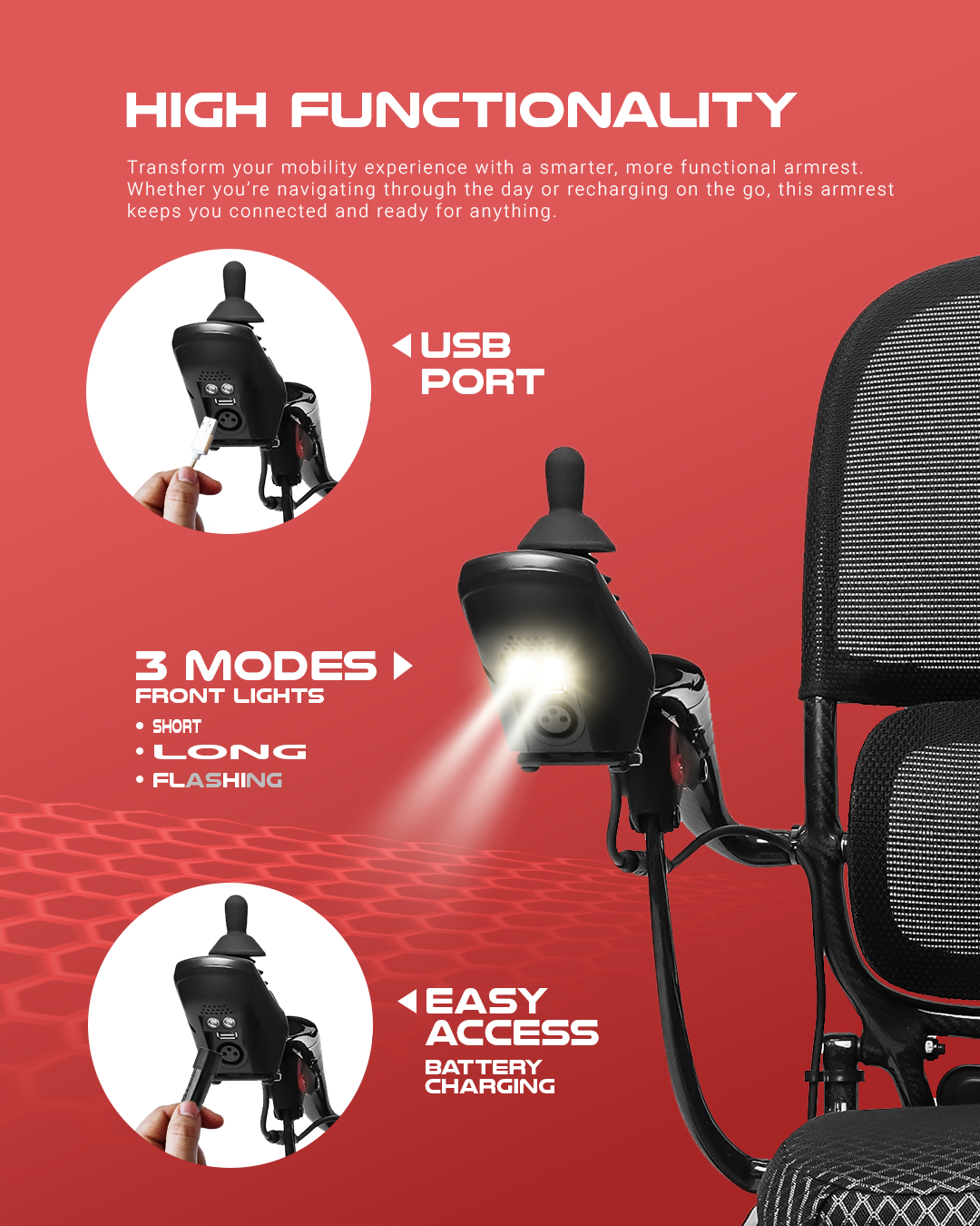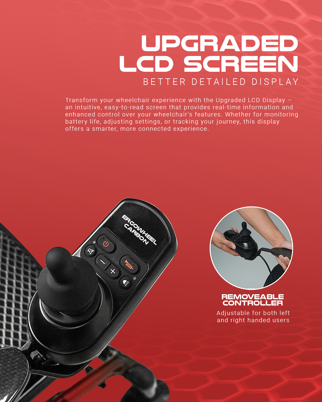 The MOBOT Ergowheel Carbon Electric Wheelchair combines ergonomic comfort with advanced functionality. Its joystick navigation, firm seat cushion, and lumbar support ensure ease and stability, while upgraded lights, an LCD screen, and anti-tip features enhance safety and convenience. Weighing just 14kg¹, the Ergowheel Carbon is portable and lightweight for travel.