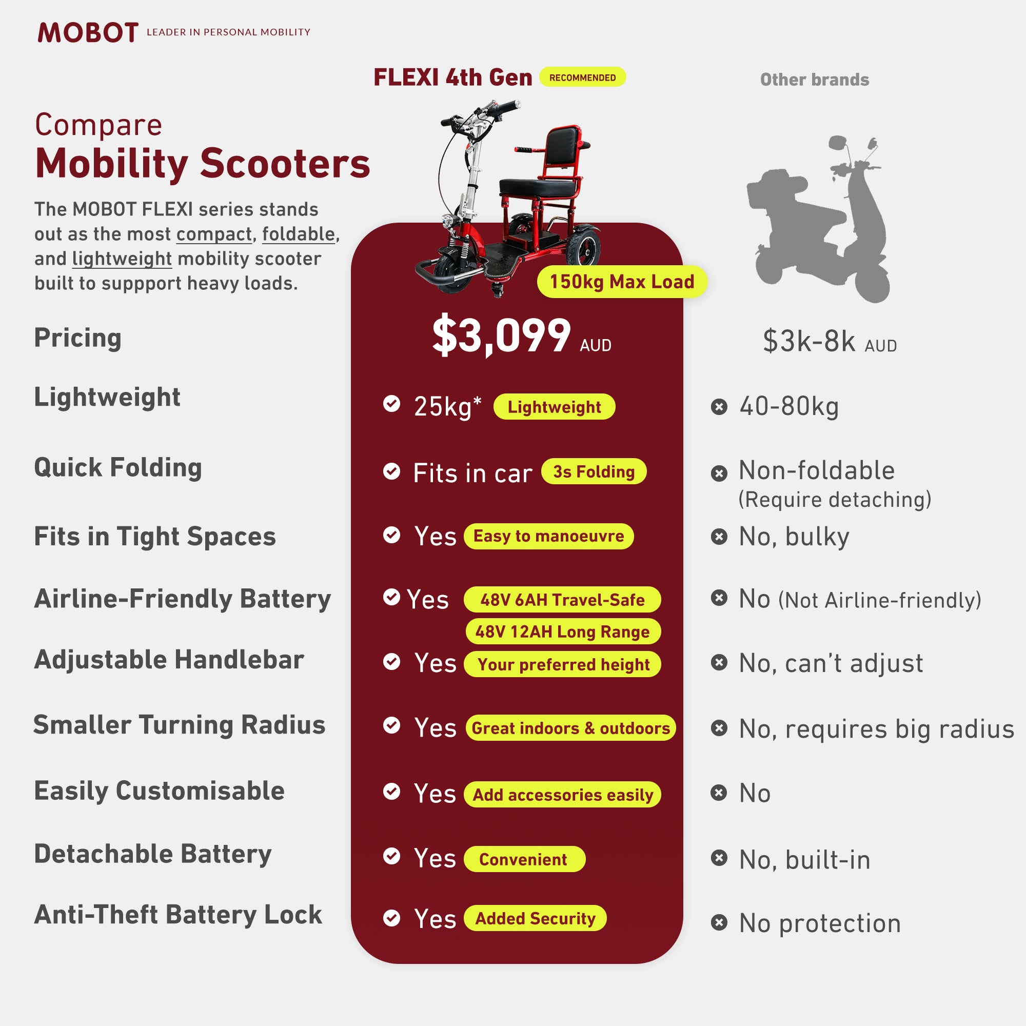 Say hello to the MOBOT FLEXI 4th Gen, the latest and greatest in our popular compact mobility scooter series! Need something adaptable? This little gem has you covered. It folds up in under 10 seconds—yes, ten—making it perfect for tucking into your car boot. And with its airline-compliant battery option, the FLEXI 4th Gen is your go-to for hassle-free travel.