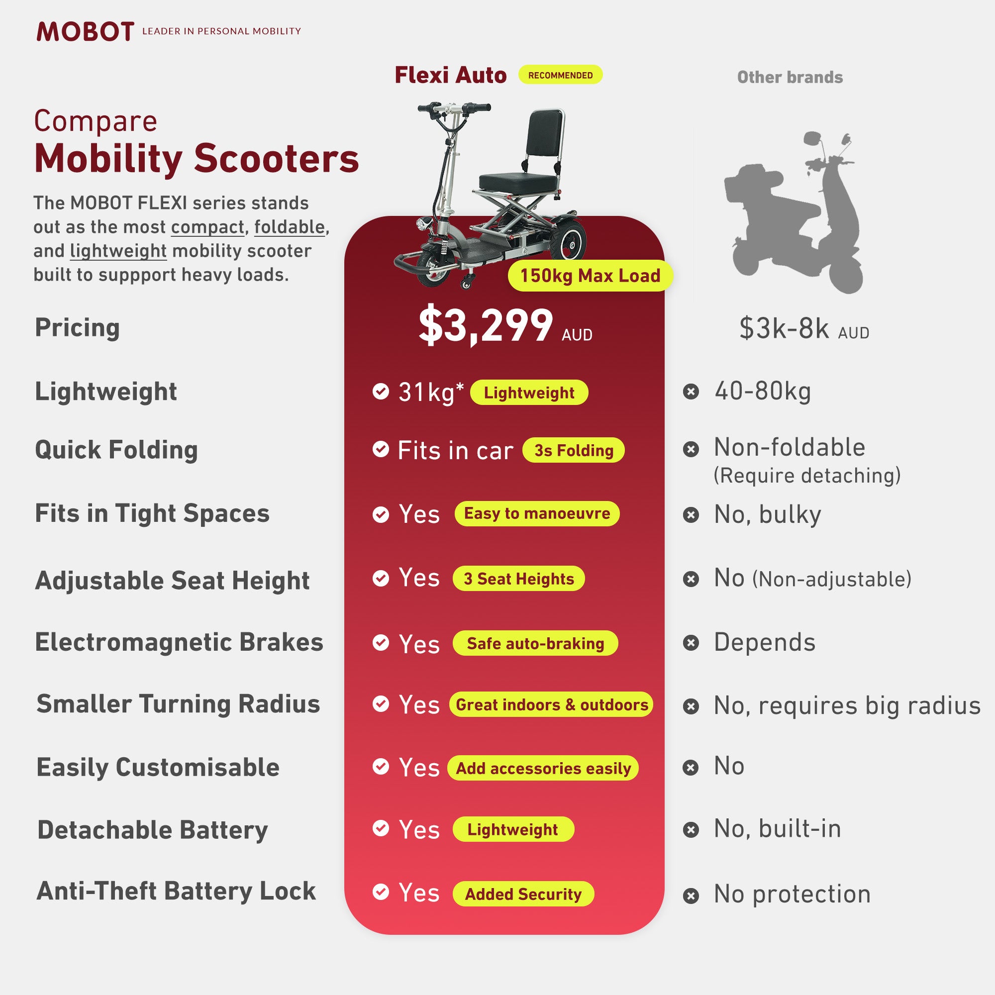 Introducing the MOBOT FLEXI Auto, the latest in our top-selling FLEXI series! With its game-changing auto-braking feature—first of its kind for a twist throttle mobility scooter—safety is enhanced like never before. The adjustable seat accommodates users of varying heights, making it the ideal compact travel companion!