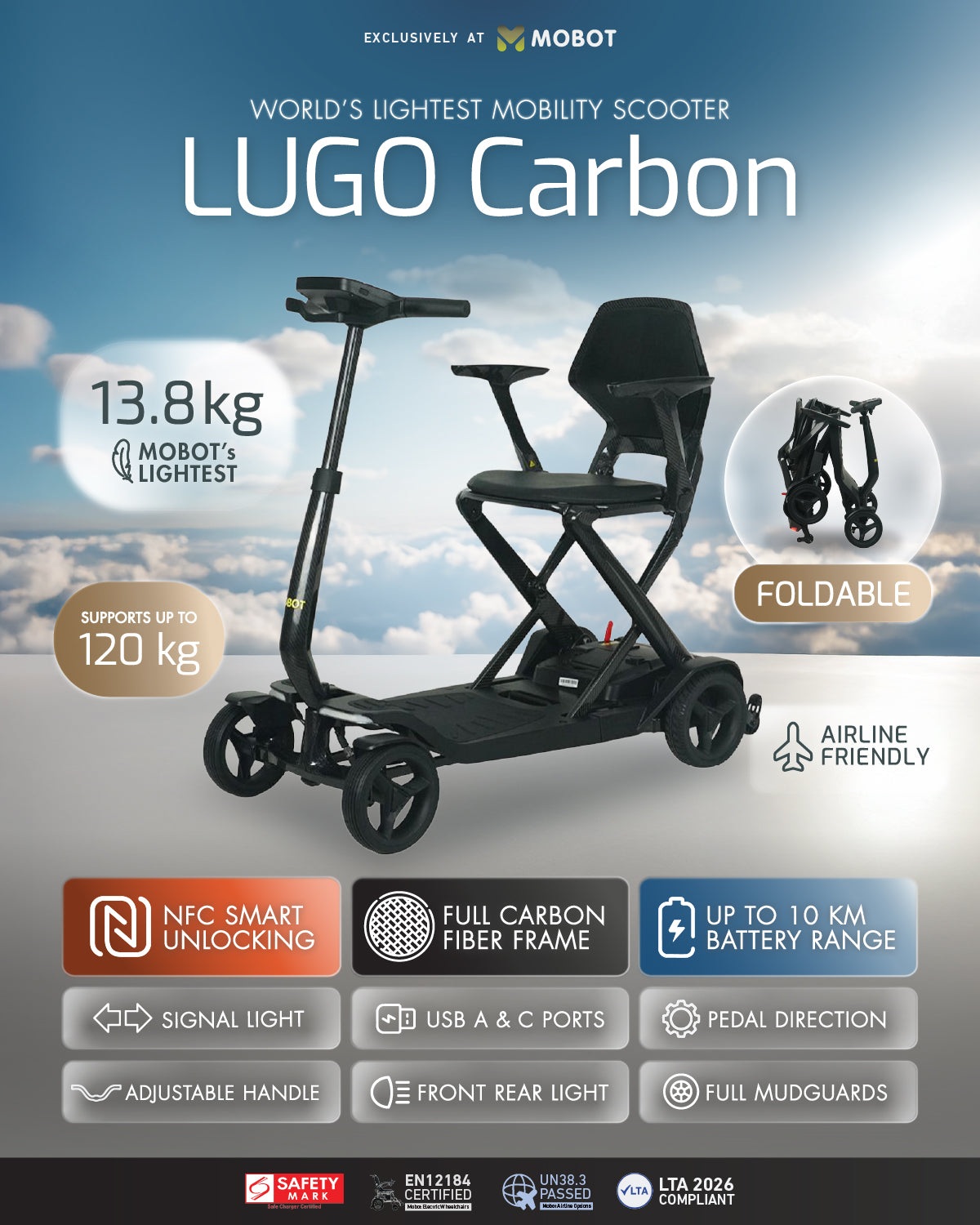 With most mobility scooters ranging from 20 to 80 kg, MOBOT’s LUGO Carbon 4-wheel mobility scooter delivers an ultra-lightweight solution without compromising on quality or comfort.