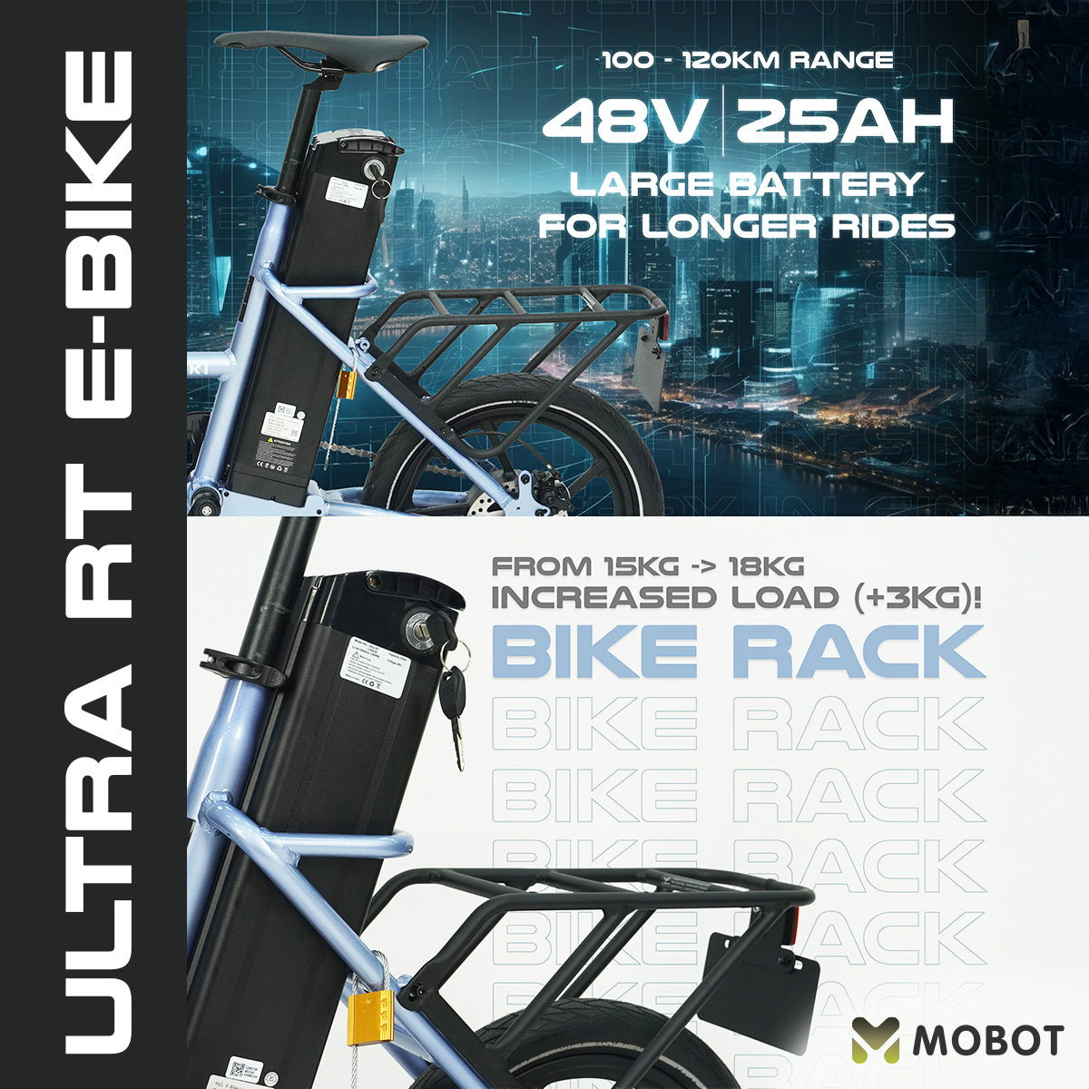 The MOBOT Ultra RT is the longest mileage E-Bike in Singapore with water-resistant controllers. Upgraded with a patent-pending Rain Tech (RT) controller for reliable performance in any weather, it features a low top tube for quick mounting and dismounting. With a 48V 25AH battery offering up to 120 km per charge and 16″ tyres with reflective strips for comfort and visibility, the Ultra RT is built for food delivery and courier riders. Additional features include wide platform pedals, an adjustable handlebar, front carrier block, and rear rack for practicality and convenience.