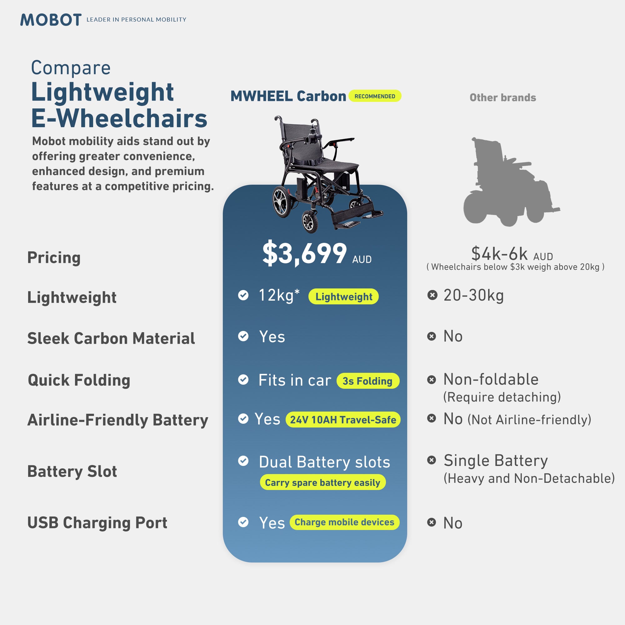 Meet the MWHEEL Carbon, our ultra-lightweight electric wheelchair weighing just 12kg¹! Crafted from expertly woven carbon fibre construction for exceptional strength, it balances portability with performance. This stunning device offers simple, user-friendly features, making it the ideal companion for users seeking a featherlight, simple and stylish travel solution.