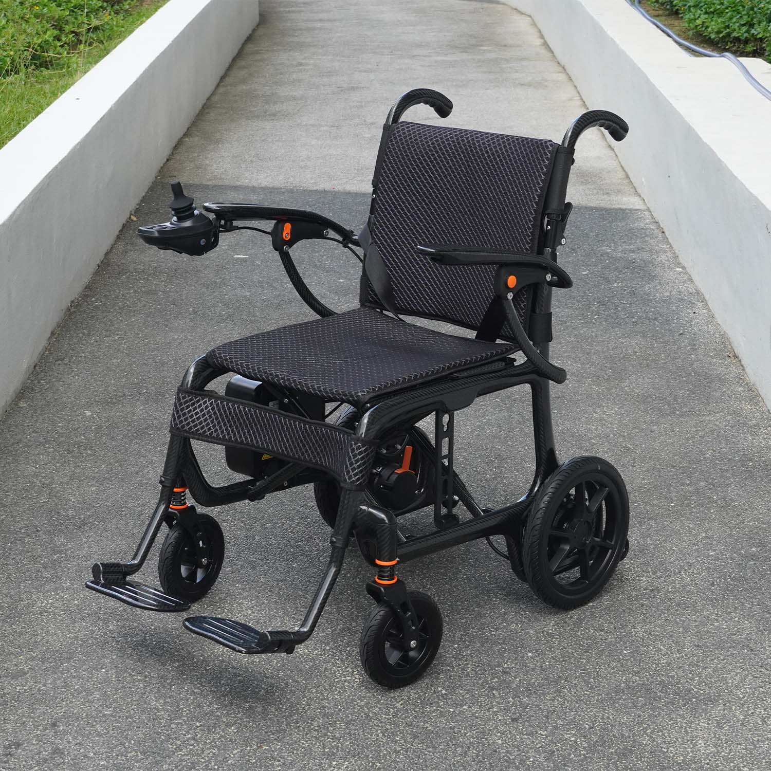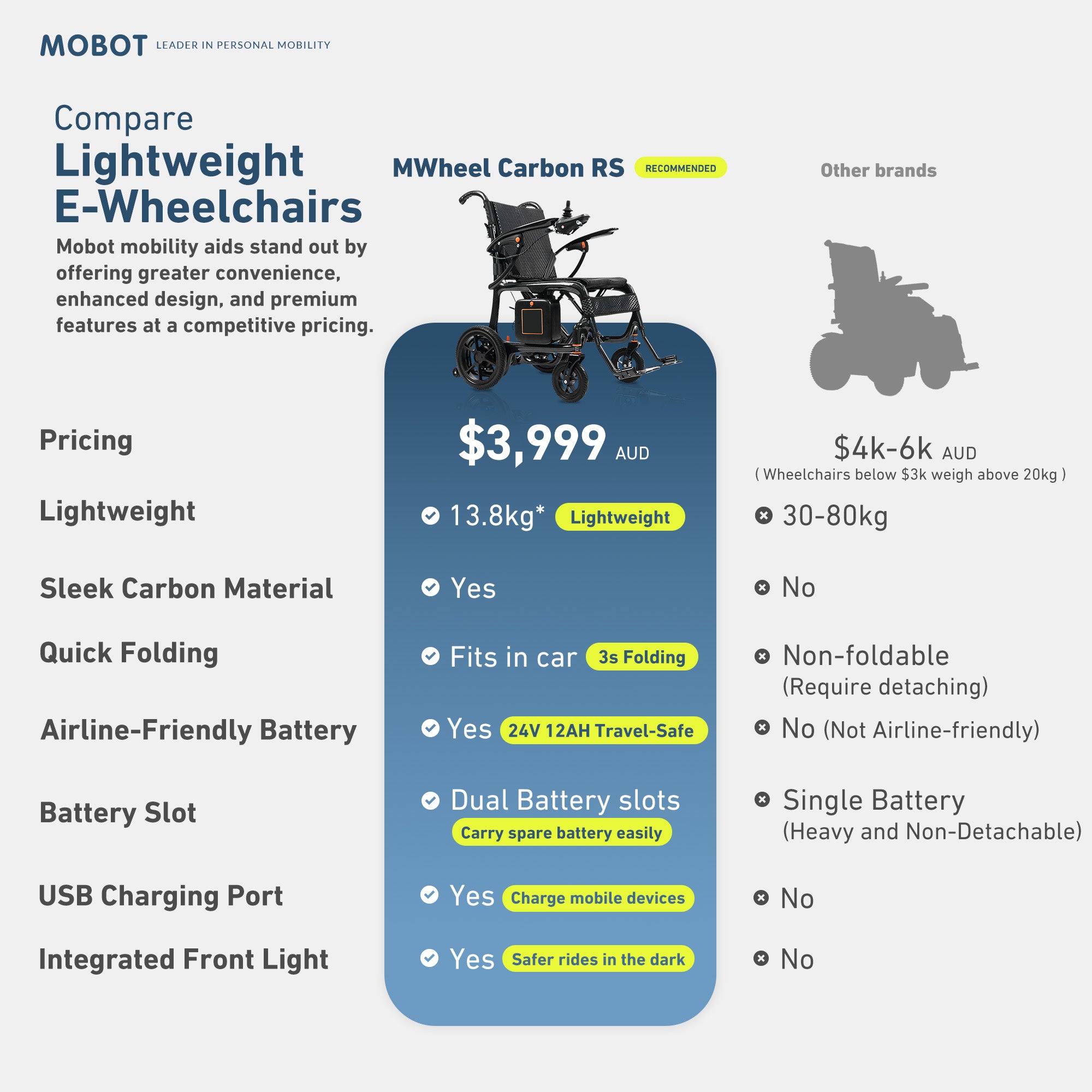 Searching for a featherweight electric wheelchair that excels in performance? The MWHEEL Carbon RS weighs only 13¹kg, thanks to its expertly woven carbon fibre construction for exceptional strength. It's effortlessly foldable and portable, featuring dual motors and smart safety options like an integrated headlight—perfect for stylish, reliable travel!