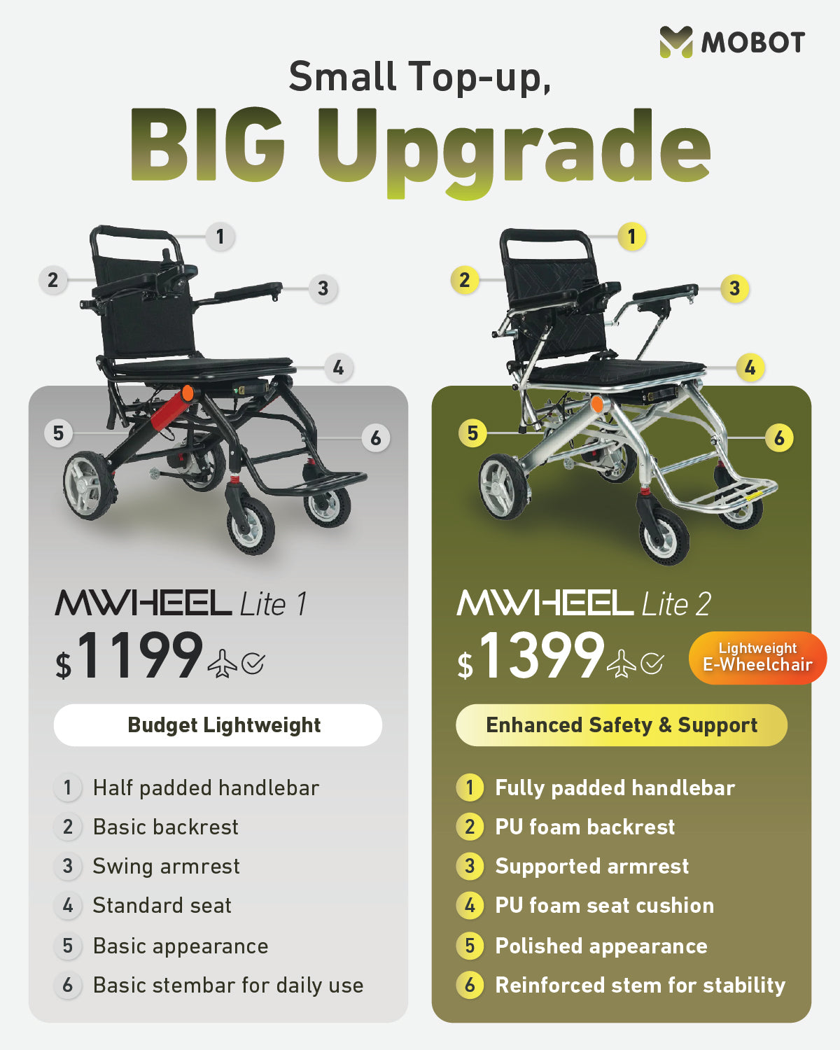 Say hello to the MOBOT MWHEEL Lite 1 a motorised electric wheelchair designed for portability and ease. Weighing just 14.3kg, it features full suspension for a smooth ride, anti-tip wheels for added safety and an airline-compliant battery. Travel-friendly, it's a safe, budget-conscious solution for lightweight, independent mobility.