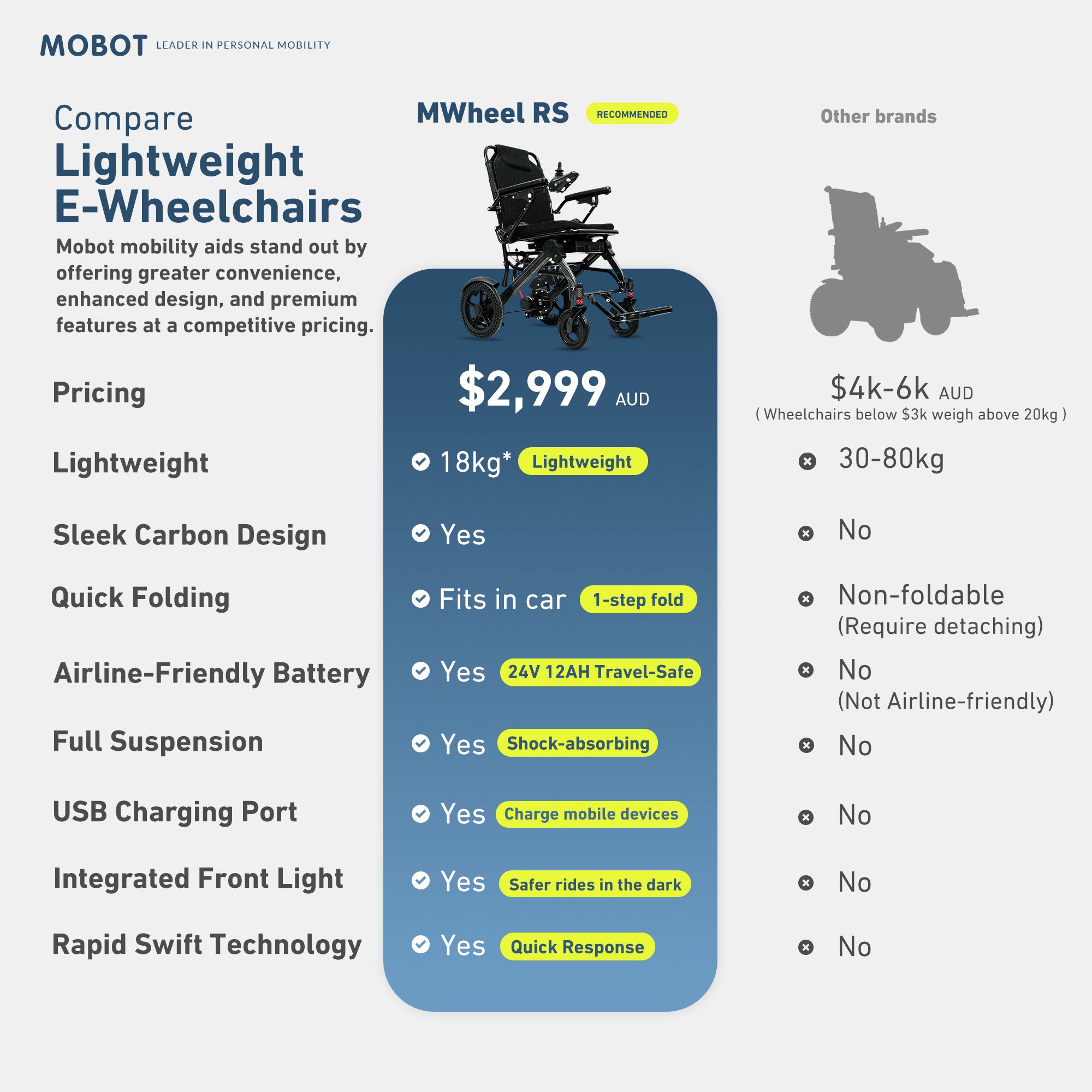 Looking for a wheelchair that’s light on weight but heavy on features? Meet the MOBOT MWHEEL RS, our first lightweight full-suspension e-wheelchair at just 18kg¹! With mudguards to keep you clean, a stylish carbon finish, and an integrated headlight, it is sleek, reliable, and perfect for rolling or travelling!