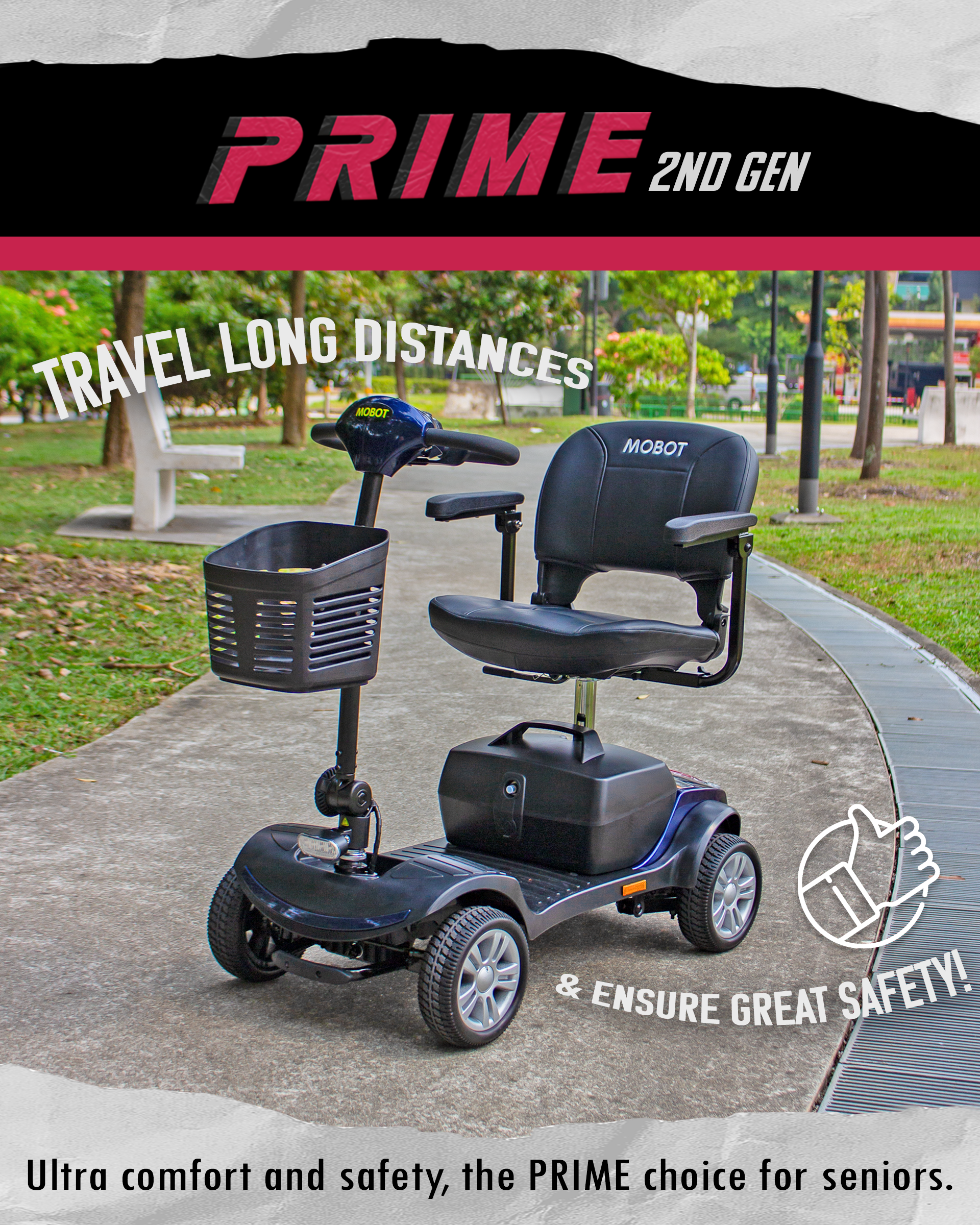 The MOBOT Prime 2nd Gen is the upgraded 4-wheel mobility scooter designed for long-distance travel. Featuring a powerful motor, 20AH battery, rear suspension, and 8.5” puncture-proof tires, it offers a smooth, safe ride with intelligent braking and anti-tip features. Ergonomically designed with a delta tiller, adjustable swivelling seat, and retractable armrests, it ensures comfort and ease for riders and caregivers. Easily disassembled for transport, the PRIME 2nd Gen is the ideal choice for those seeking reliability, safety, and convenience on the go.