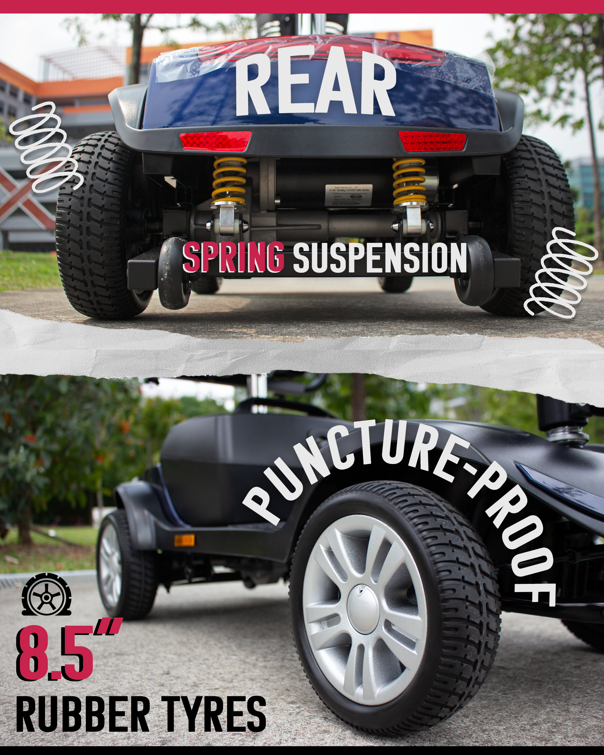 Ride in comfort with rear spring suspensions, and worry less with 8.5" puncture proof rubber tyres.