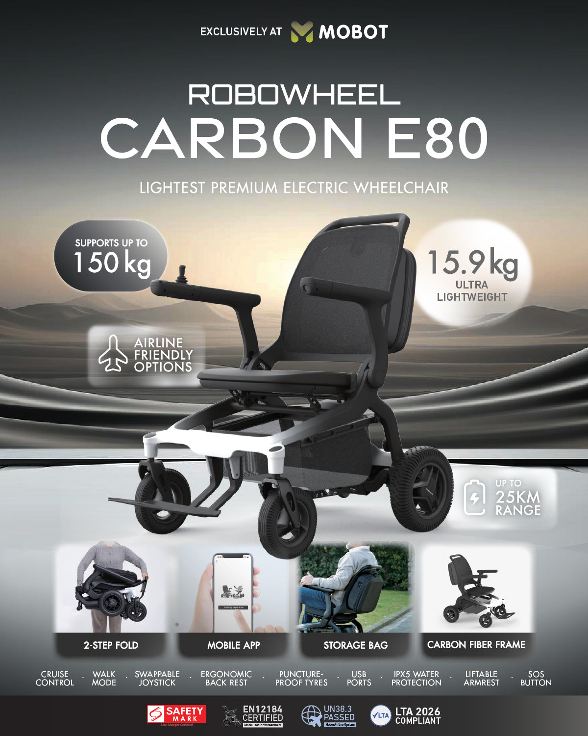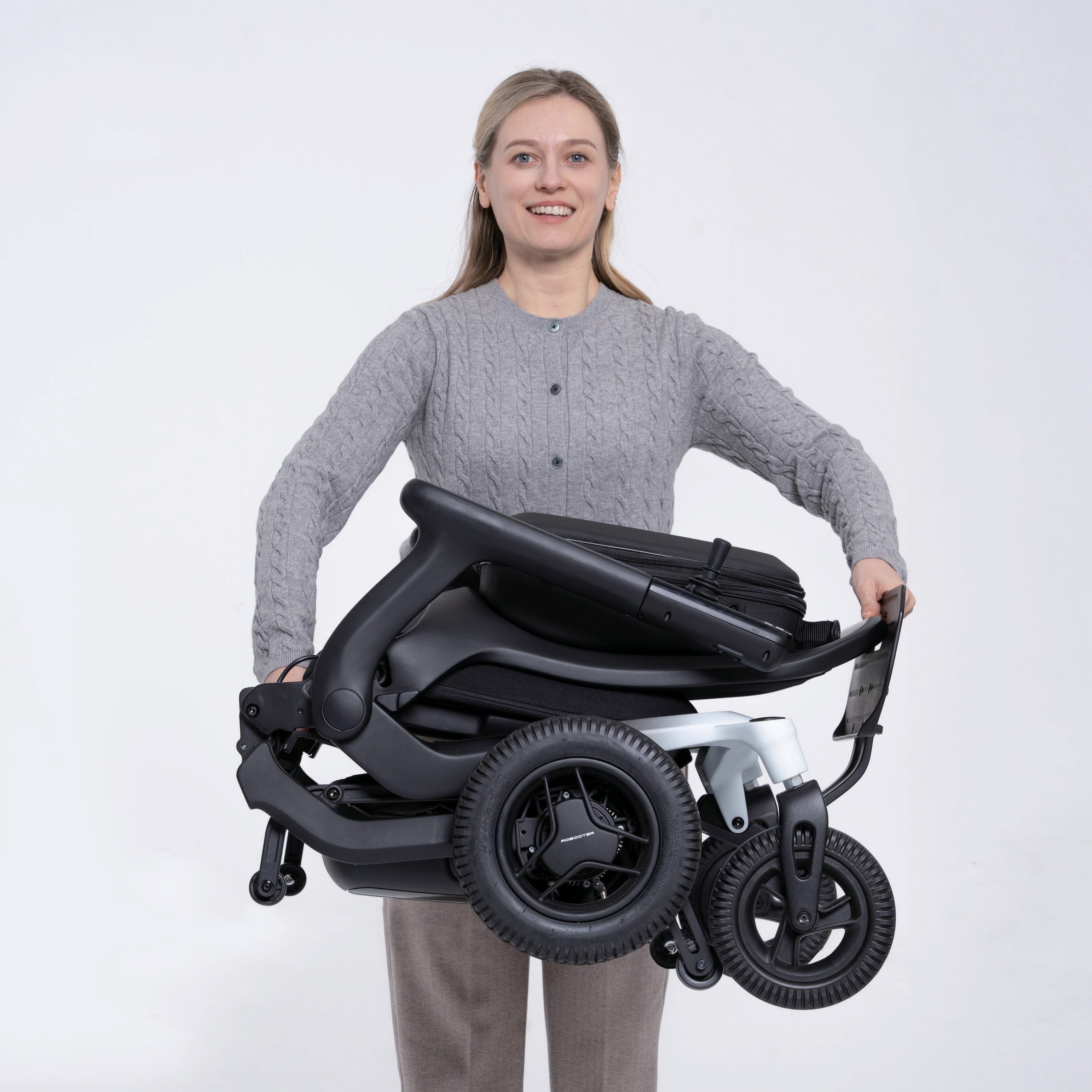 Meet the ROBOWHEEL Carbon E80 – a sleek, ultra-light electric wheelchair weighing just 15.9 kg¹, thanks to its carbon fiber frame. Despite its featherweight build, it supports up to 150 kg, climbs obstacles up to 40 mm, and folds easily. With smart app control, remote steering, an airline-compliant battery, and a new hard case bag with ergonomic backrest, it’s your ultimate travel-ready companion for strength, comfort, and everyday ease.