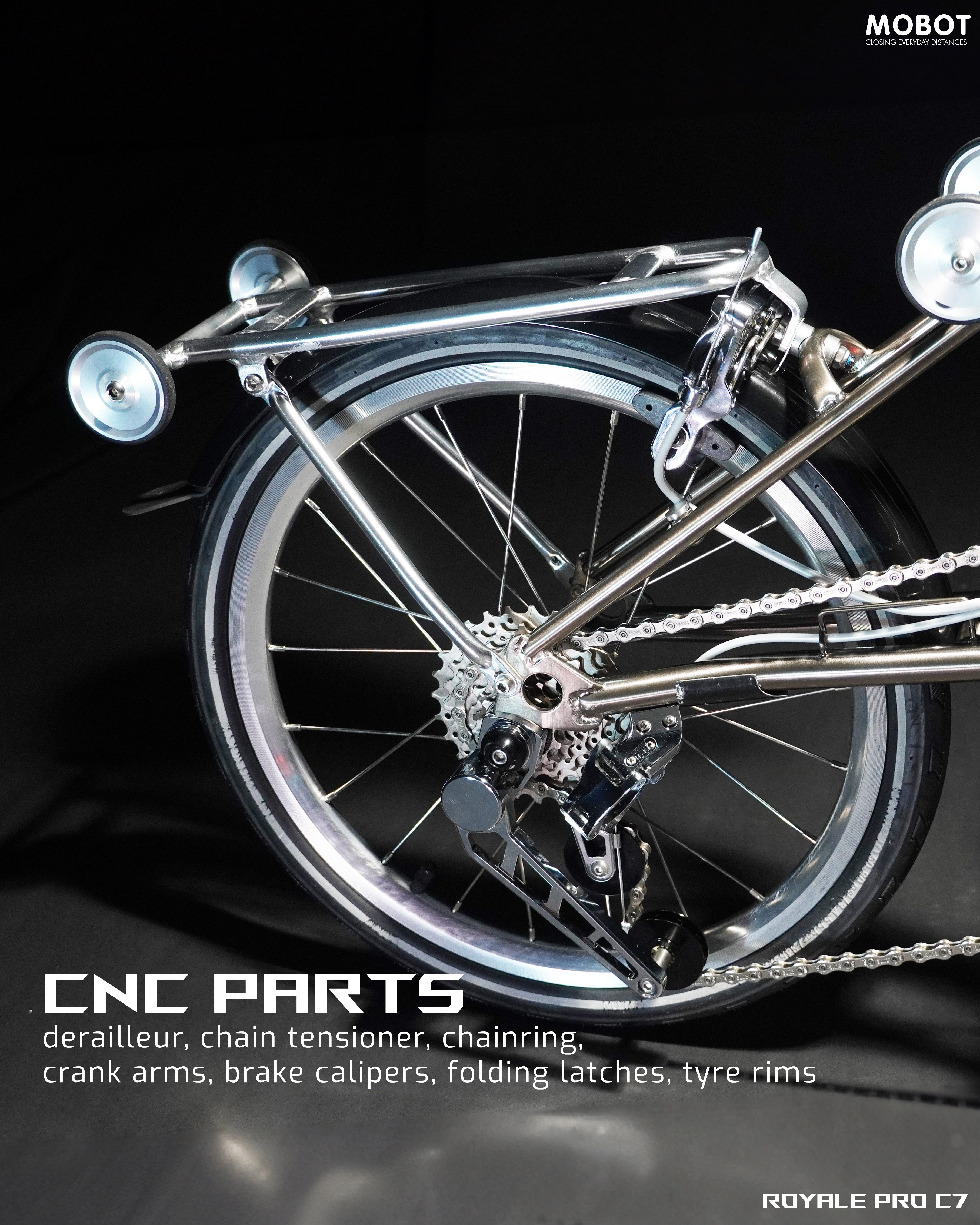 Using custom CNC parts with high strength and adapting better design choices, the ROYALE PRO C7 is one of the most reliable and easily maintainable tri-fold bicycles out there.