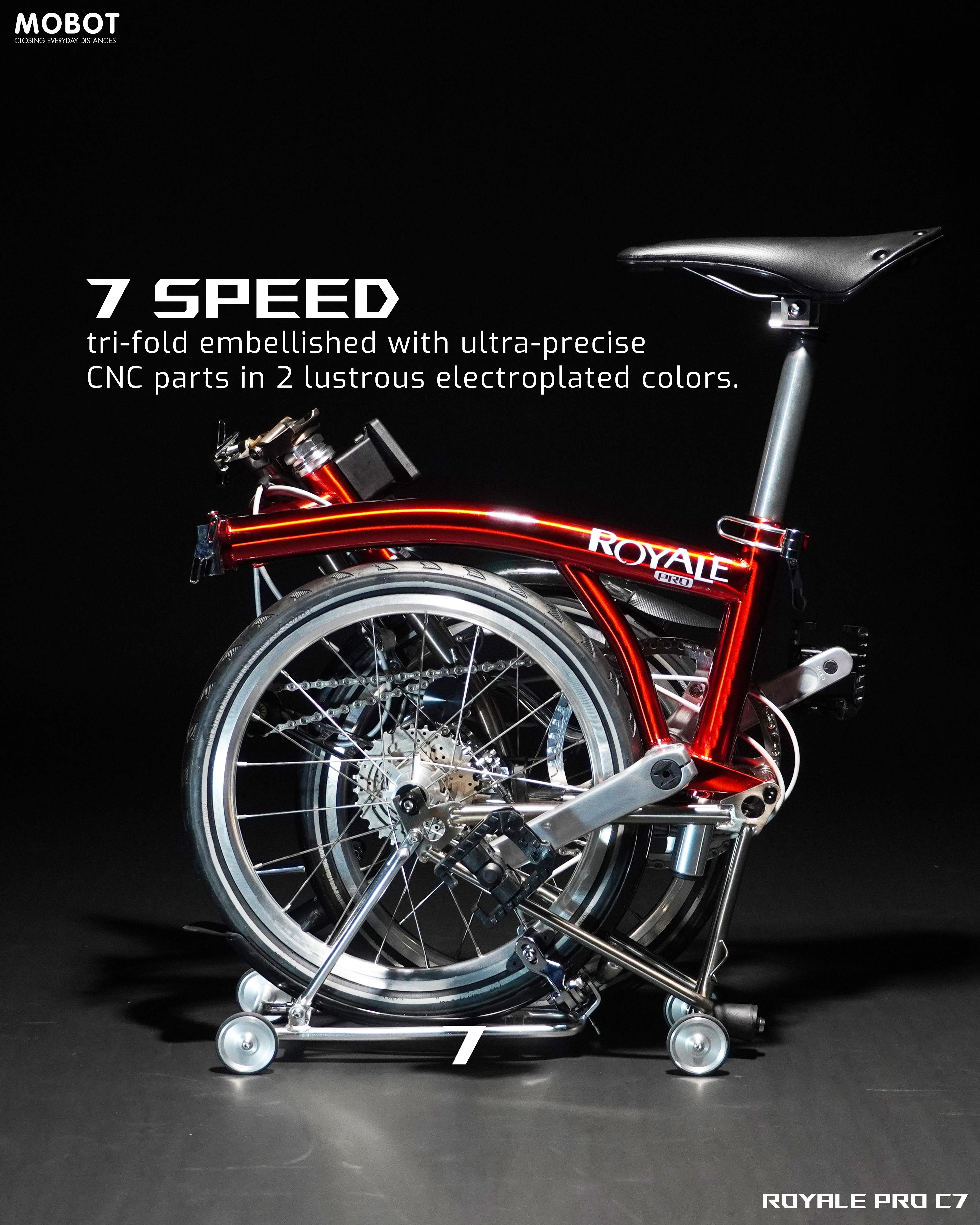 - Smaller fold width, compact design of the ROYALE Pro C7, with CNC parts, results in a bike that takes up less space during storage